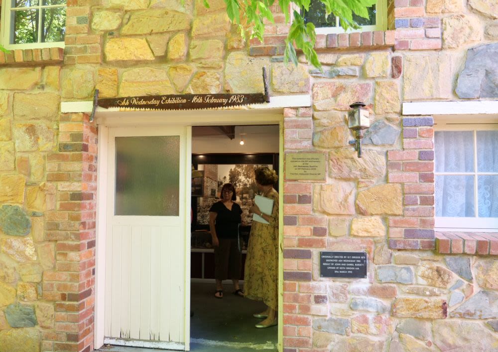 Julie Herraman, President at the Prospect Hill Historical Museum, takes Laura Kroetsch from the History Trust of South Australia on a tour of the site and Ash Wednesday exhibition, 2023. Photo from the History Trust of South Australia.