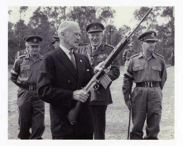 Badcoe (far right) with Governor General Lord Casey (centre) on a visit to Greenhills Holsworthy range c. 1966