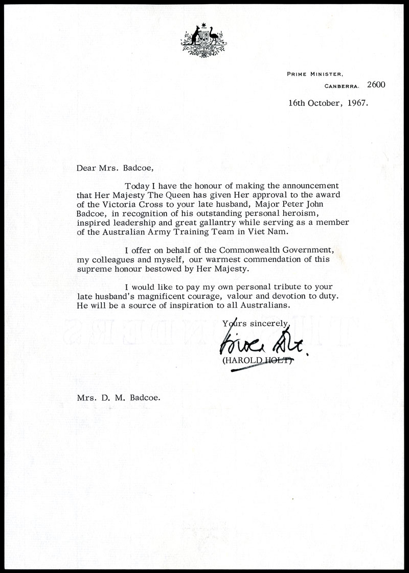 For his extraordinary feats, Badcoe was posthumously awarded the Victoria Cross. It was presented to Denise Badcoe by Governor-General, Lord Richard Gavin Gardiner Casey, at Parliament House on 5 April 1968.