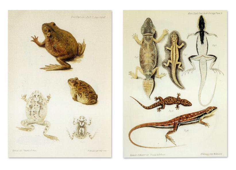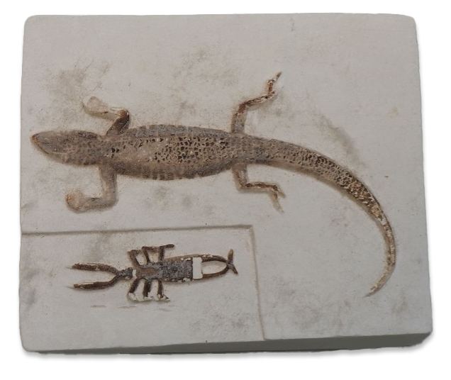 Gypsum plaque with coloured relief carving of a lizard and a small invertebrate – possibly among those natural history specimens collected by Aboriginal people at Charlotte Waters, for scientists and museums. Carved by Jim Kite Erliakilyika. [SAM A35738]