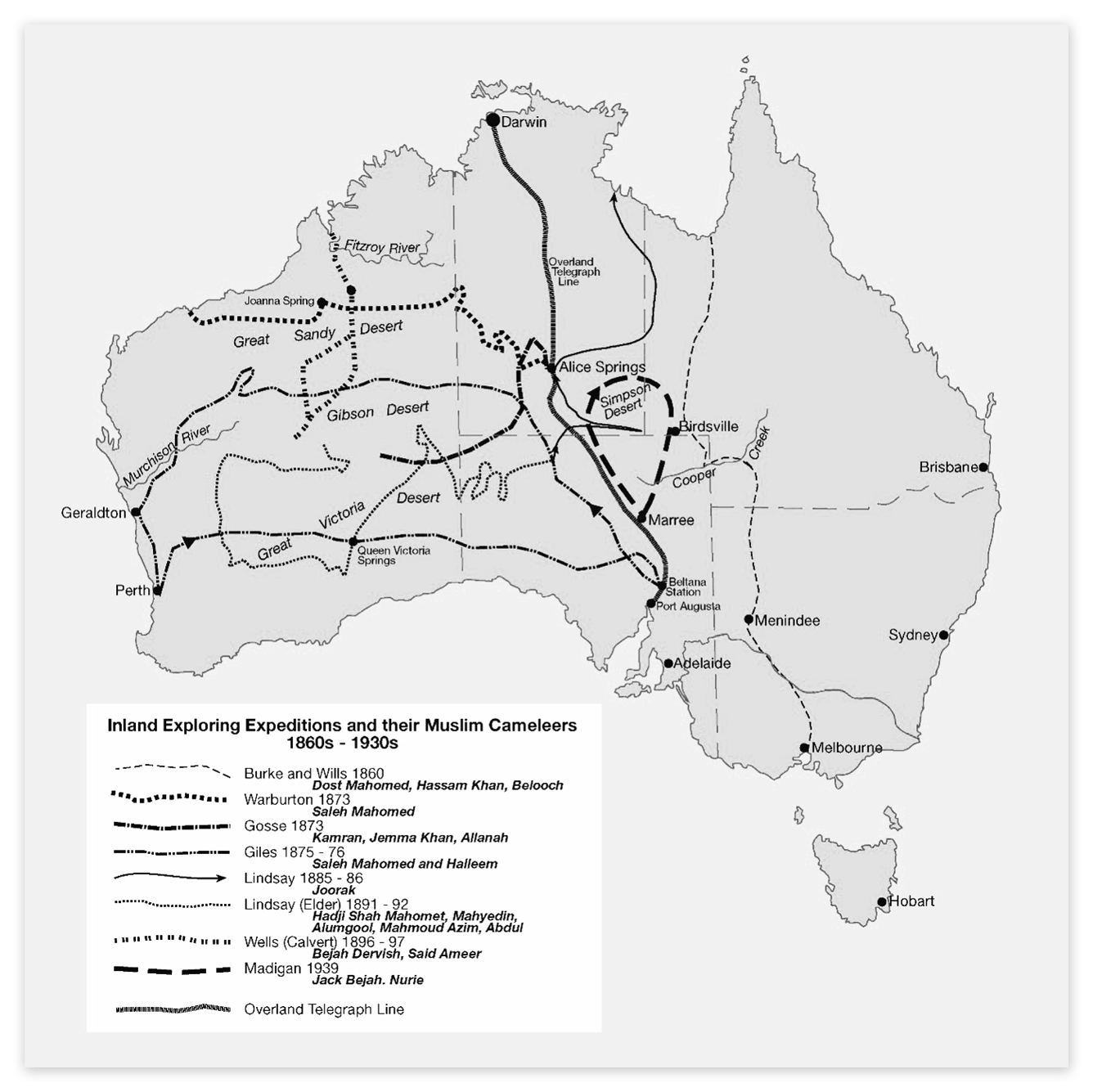 This map, focusing upon the participation of ‘Afghan’ cameleers in inland exploration during the 1860s and 1870s, highlights the importance of the Overland Telegraph Line as a base for exploration of the western desert and as a means of finding a viable route from the Line to Perth and the western coast. [Jones & Kenny 2010, Australia’s Muslim Cameleers, Wakefield Press, Adelaide, p.52]