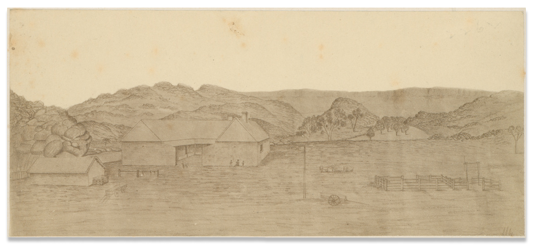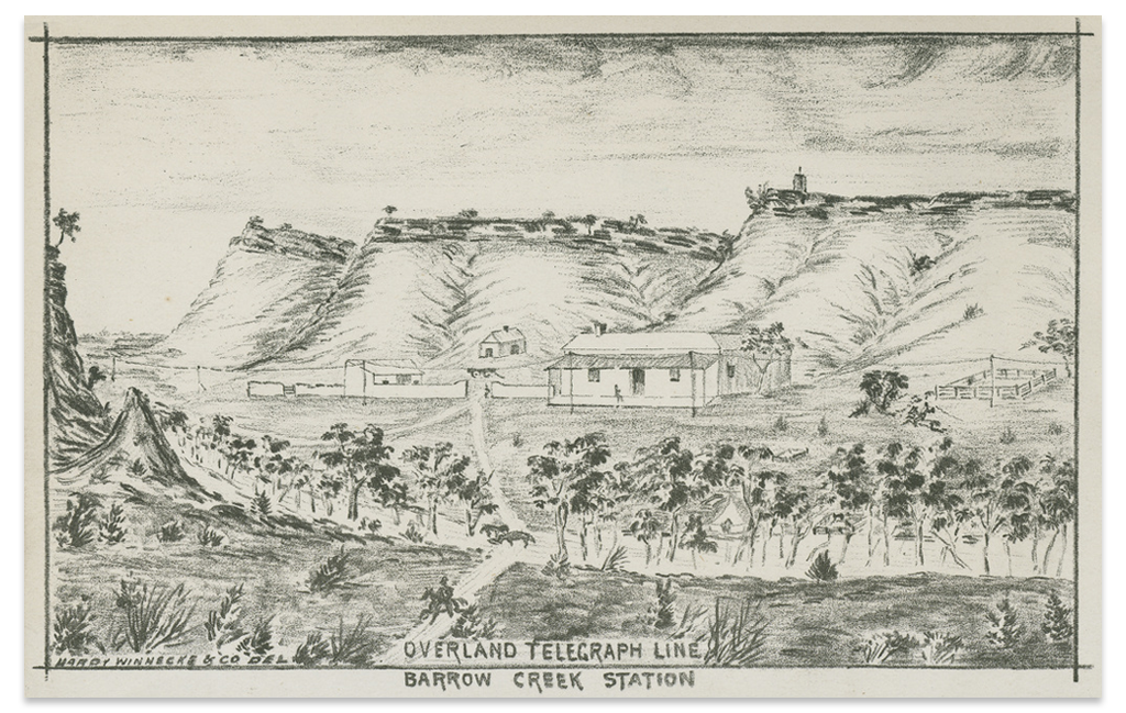 A 1879 sketch of the Barrow Creek Telegraph Station depicts it five years after this event, framed by majestic escarpments in the background. A station worker on the verandah appears to carry a rifle. [SLSA B 10259]