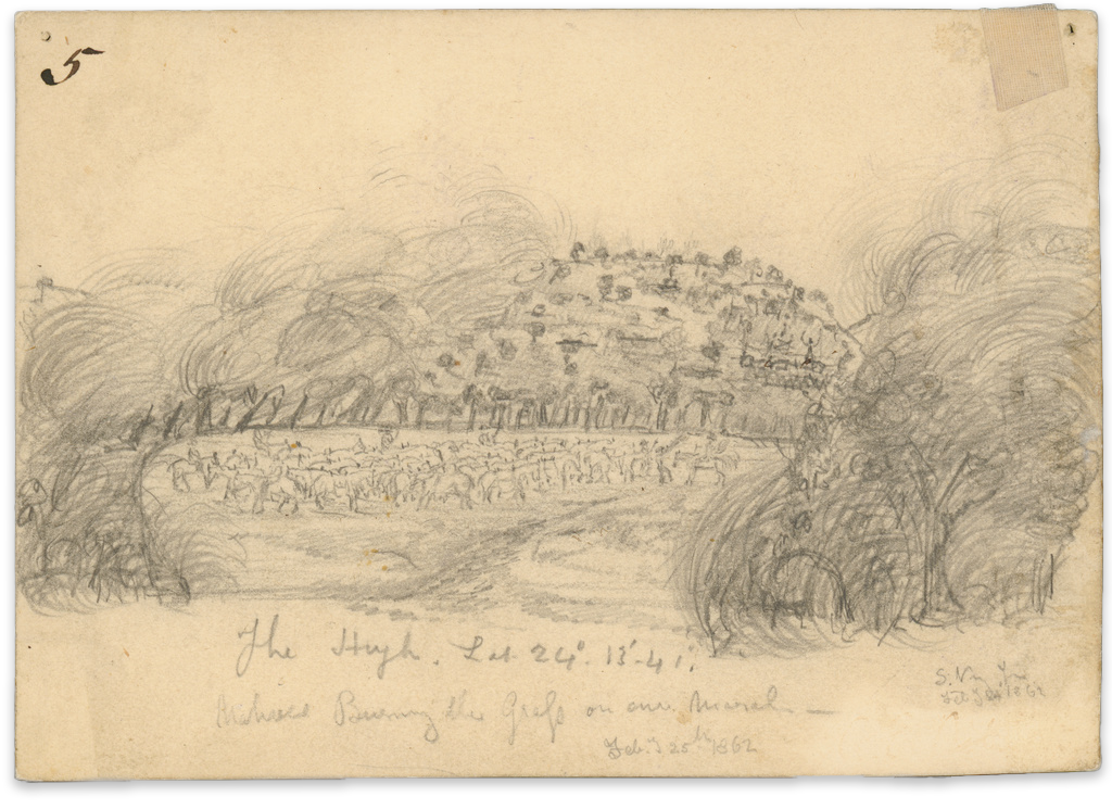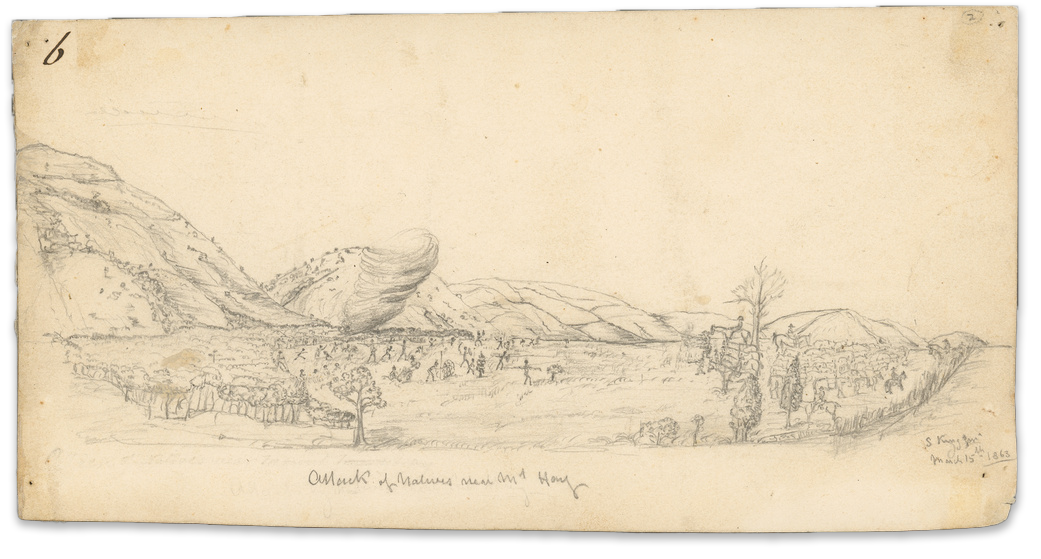 King’s sketch of the fight at Mount Hay. Initially, four Aboriginal men approached the group, quickly increasing after Stuart ordered the party to fire [SLSA B 486/6]