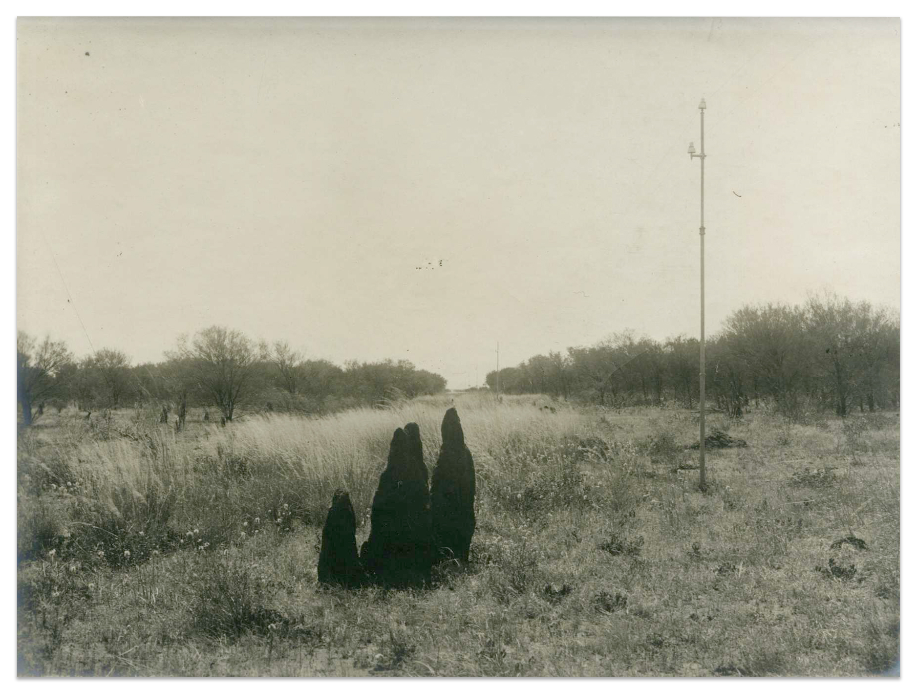 The Overland Telegraph Line, photographed by Baldwin Spencer in 1901, just north of Tennant Creek telegraph station. The cleared bush track would become the Stuart Highway. [SAM AA108]