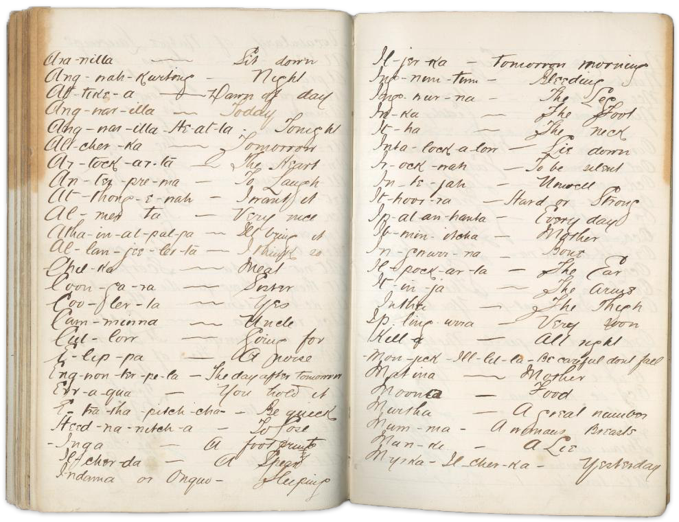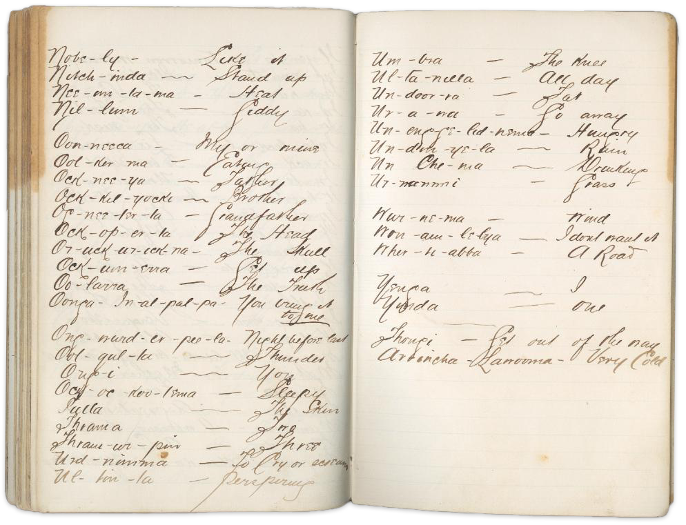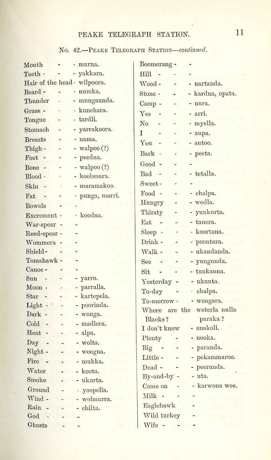 Gillen’s Lower Arrernte vocabulary, recorded at Charlotte Waters The vocabulary includes terms for the passing of time (‘night before last’) and future actions and conditions such as ‘hungry’, ‘sleepy’ or ‘giddy’ – suggesting that Gillen was working with a Lower Arrernte person who spoke good English. [SAM AA108]