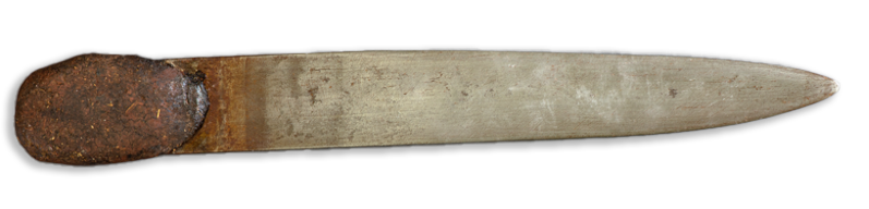 A metal knife or dagger, with spinifex resin handle and red ochred decoration. Significantly longer and sharper than the stone-bladed knife used in hand-to-hand combat among the Arrernte. Bartered to Gillen at Alice Springs Telegraph Station, 1890s. (A3949, SAM)