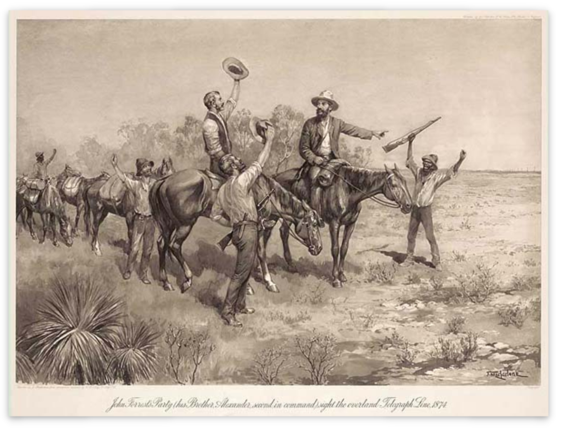 The image shown here recreates the moment when Forrest’s party sighted the Overland Telegraph Line. [NLA AN90258556]