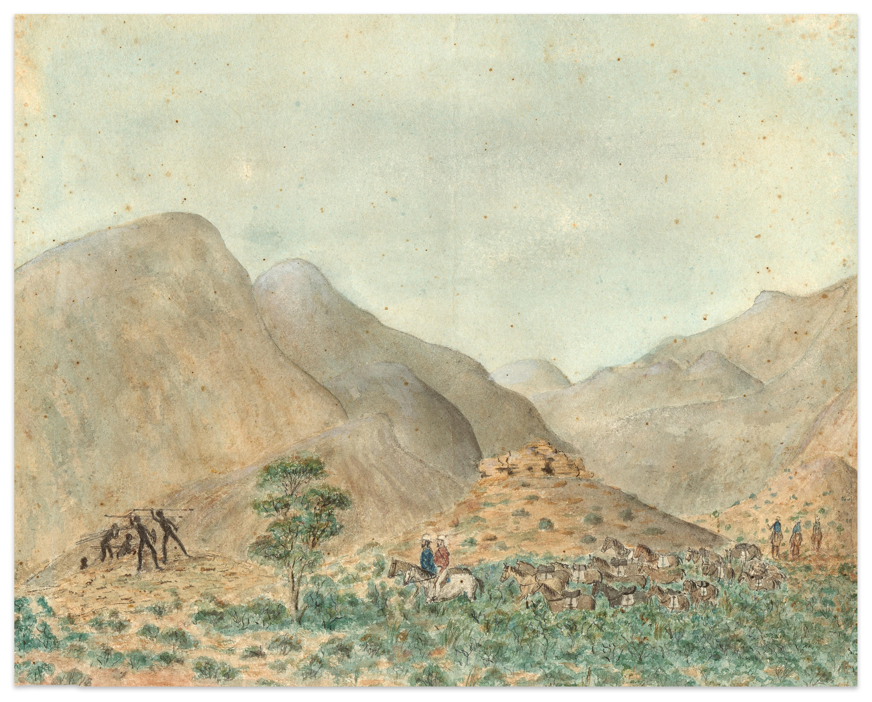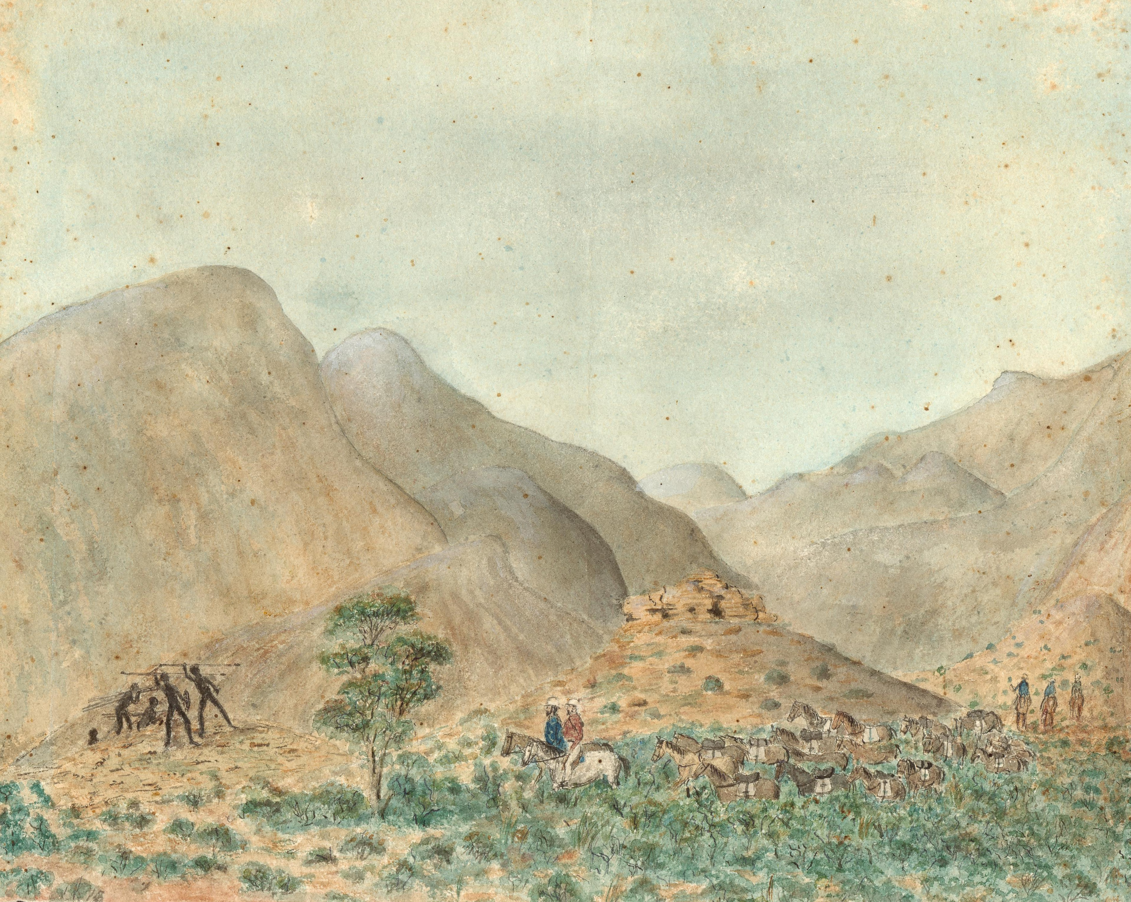 This watercolour was painted by the surveyor J.B. Harvey, who accompanied John Ross’s reconnaissance expedition of 1870. At Charles Todd’s direction, Ross was seeking a viable route for the Overland Telegraph Line through the MacDonnell Ranges and a site for a telegraph station. The image shows Ross’s party of five men and their team of pack horses and spare mounts, unaware of the armed Arrernte party, poised to attack.