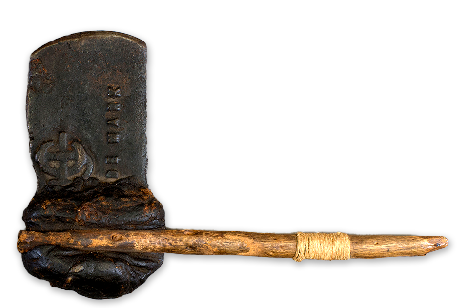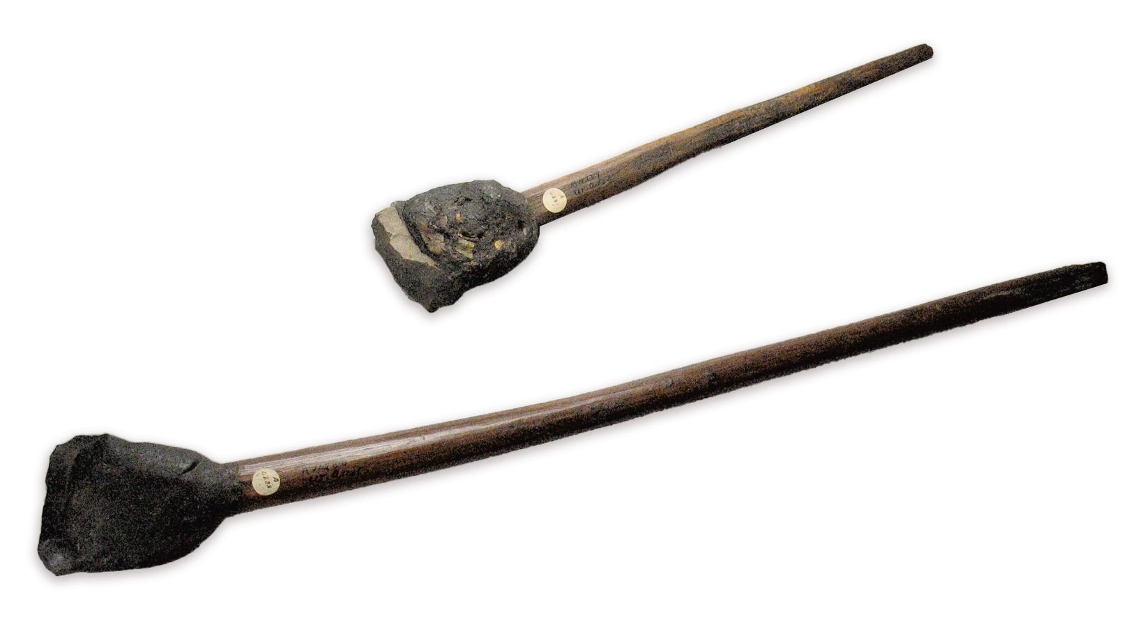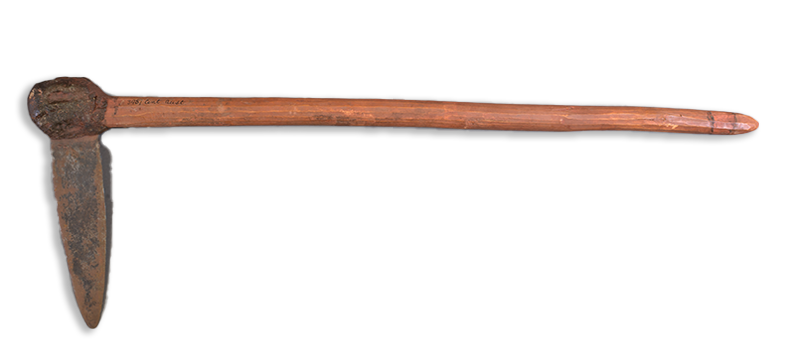 Like a stone axe, this metal axe is hafted in traditional fashion, bound to the handle with fibre string and spinifex resin and a ‘withy’ handle. [SAM A3941]