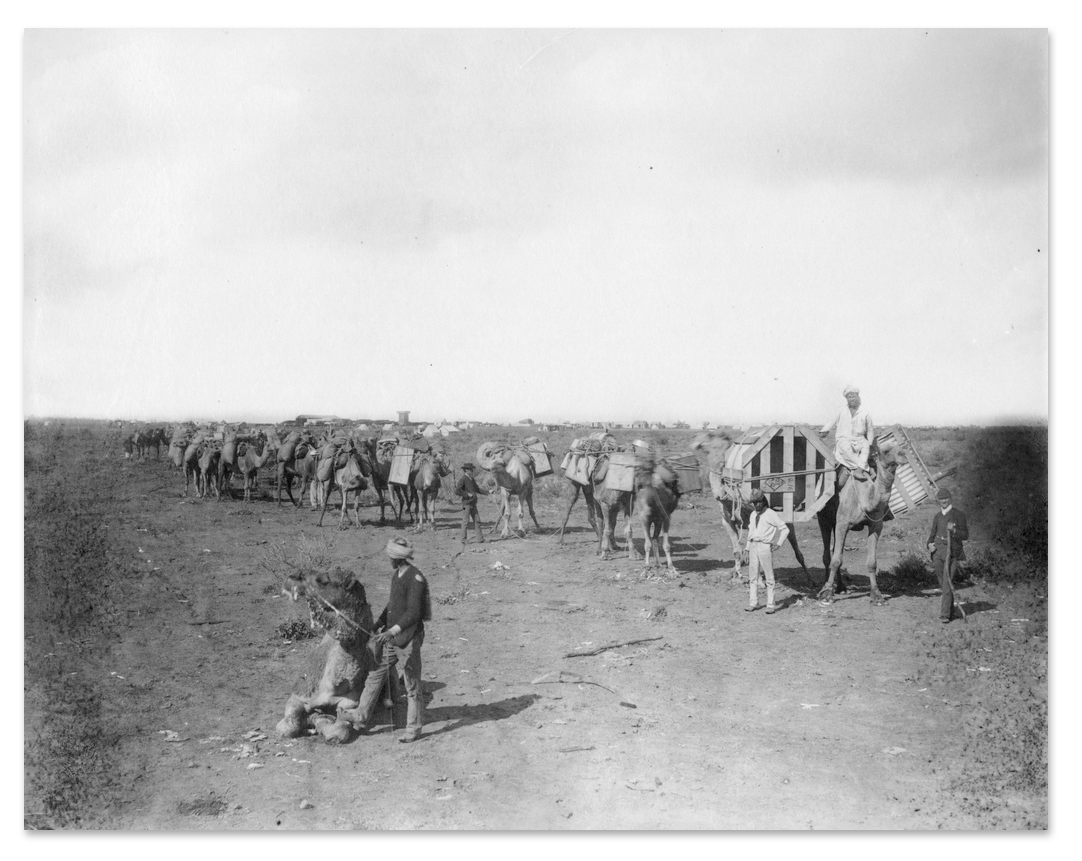 Camel team belonging to Faiz and Tagh Mohomet, leaving Warrina on the Maree railway line for Tennant’s Creek, 1889 [SLSA B 23913/10]