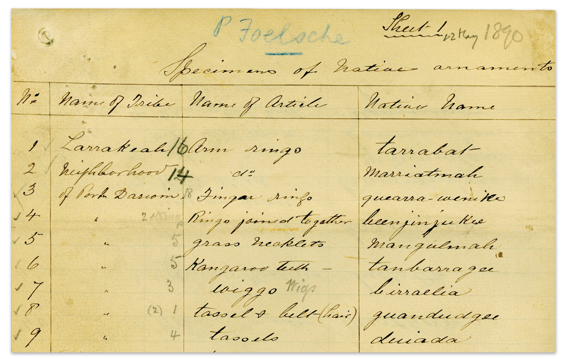 Foelsche made a detailed listing of his collection, recording the language group, the uses of the artefacts and their language names. These have become vital records of the material culture heritage of the Larrakia people, for few other Europeans showed as much interest in this subject at the time. [SAM AA298-184-95-2]