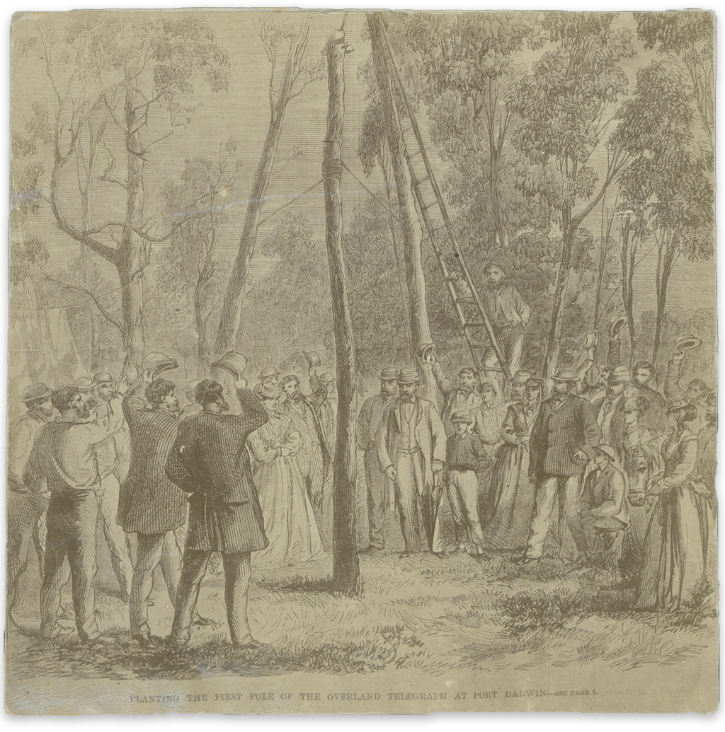 A sketch of planting the first pole for the Overland Telegraph Line northern section at Port Darwin for the illustrated press depicts a respectably dressed collection of European settlers gathered to mark the event. Larrakia people are not visible in the picture but they were present. James Stapleton, who would be fatally speared less than four years later in the attack on Barrow Creek Telegraph Station, observed Aboriginal people's reactions to the gun salute that accompanied the erection of the first Overland Telegraph Line pole, noting that it alarmed them.