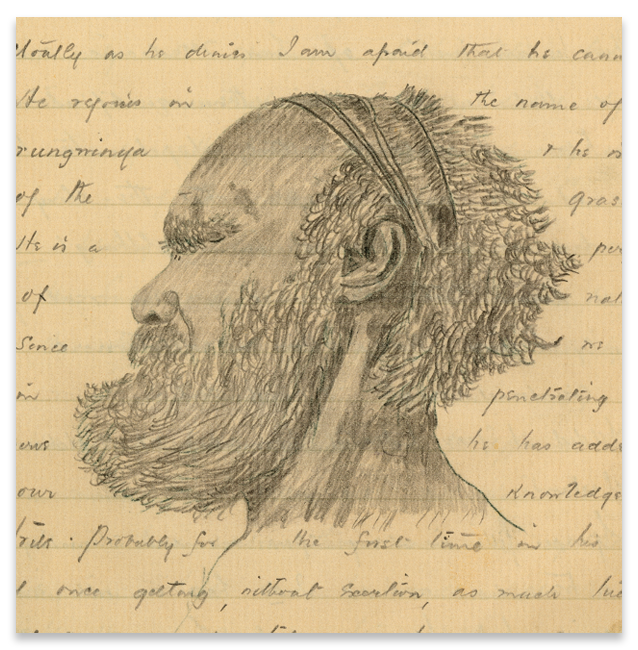 Frank Gillen’s sketch of Tungilla, Kaytetye survivor of the 1874 reprisals against the men who attacked the Barrow Creek telegraph station. During the Spencer and Gillen anthropological expedition of 1901-1902, which followed the telegraph line north from Alice Springs, Tungilla worked closely with the anthropologists to record Kaytetye language and mythology. [SLSA PRG54]