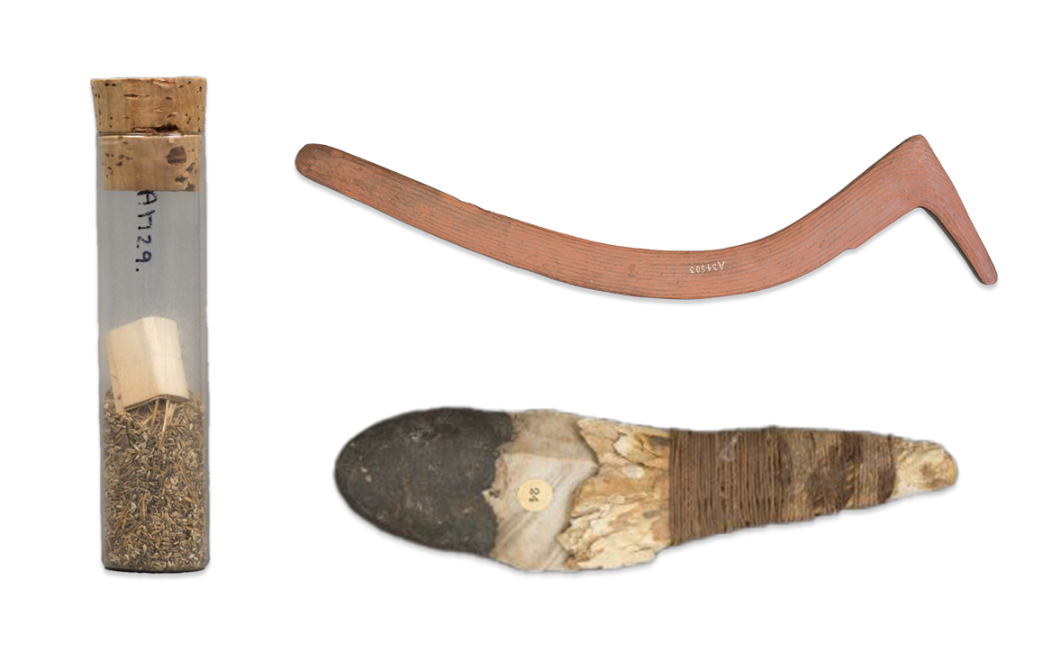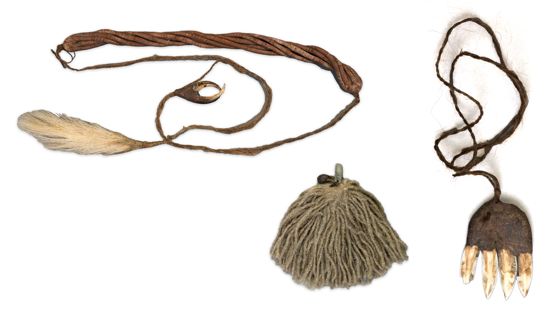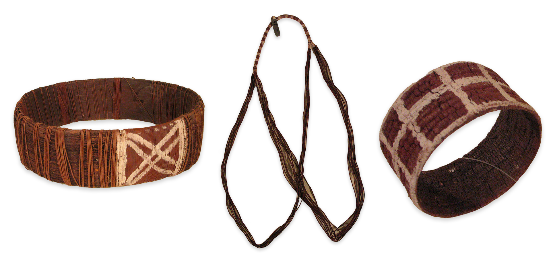 A selection of artefacts bartered to Paul Foelsche at Port Darwin during the 1870s. Unlike many frontier collectors, Foelsche was careful to obtain the full range of material culture objects, from weapons to items of domestic use, as well as necklaces, headbands and other personal items. At this time the main currency of exchange, valued more highly than money, was tobacco. Left to right: a bark belt, a woman’s chest harness, a woven cane armband [SAM A2877, SAM A3378, SAM A11740]