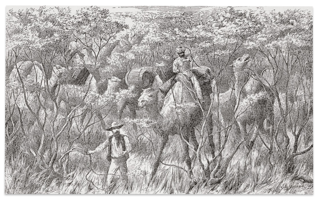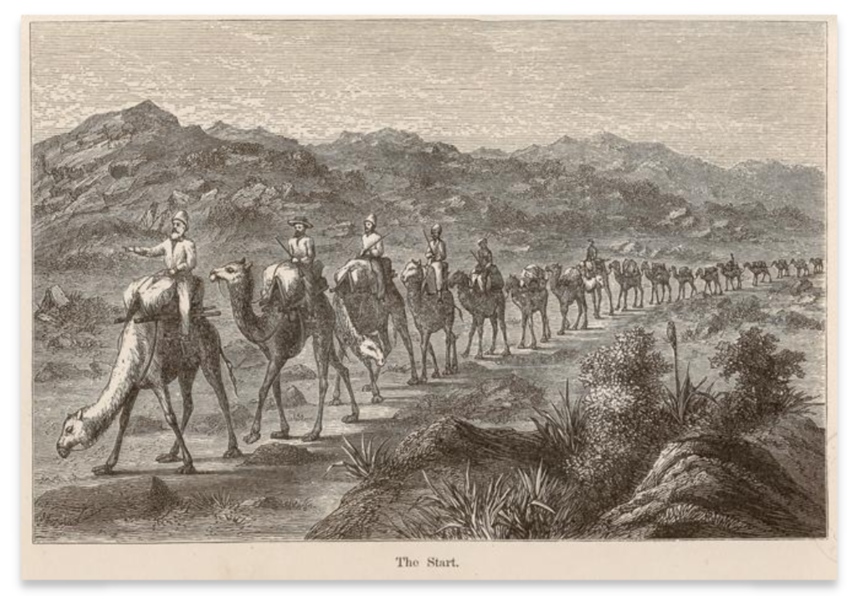 P.E. Warburton’s expedition departing from Alice Springs Telegraph Station, April 1873. [Warburton 1875]