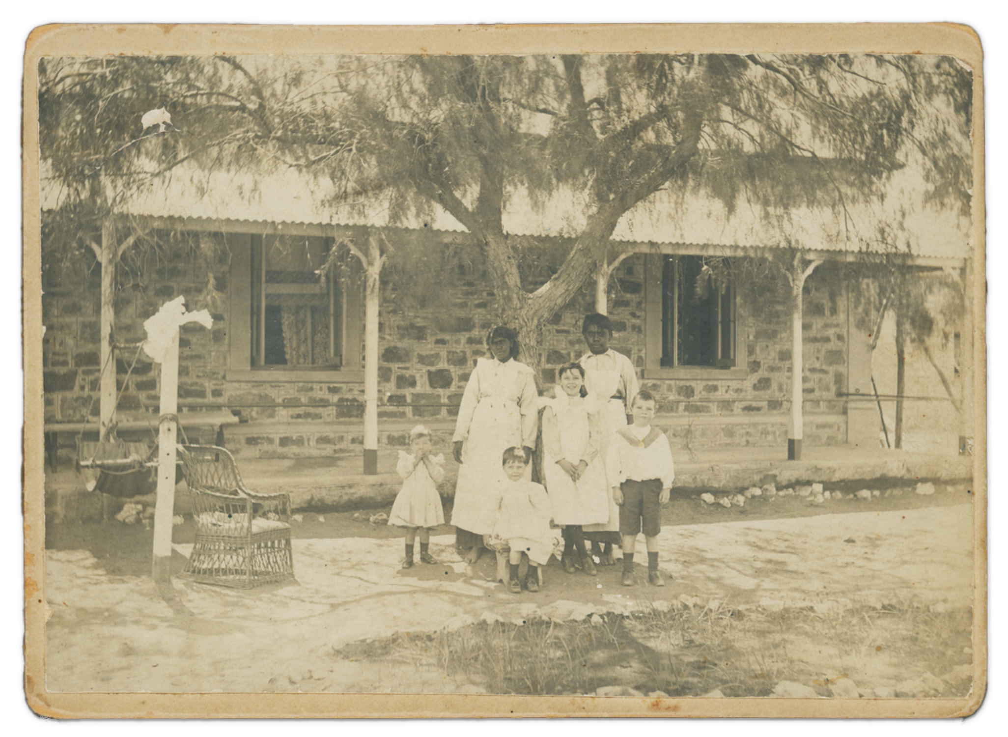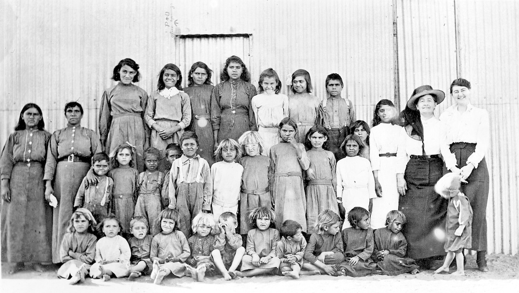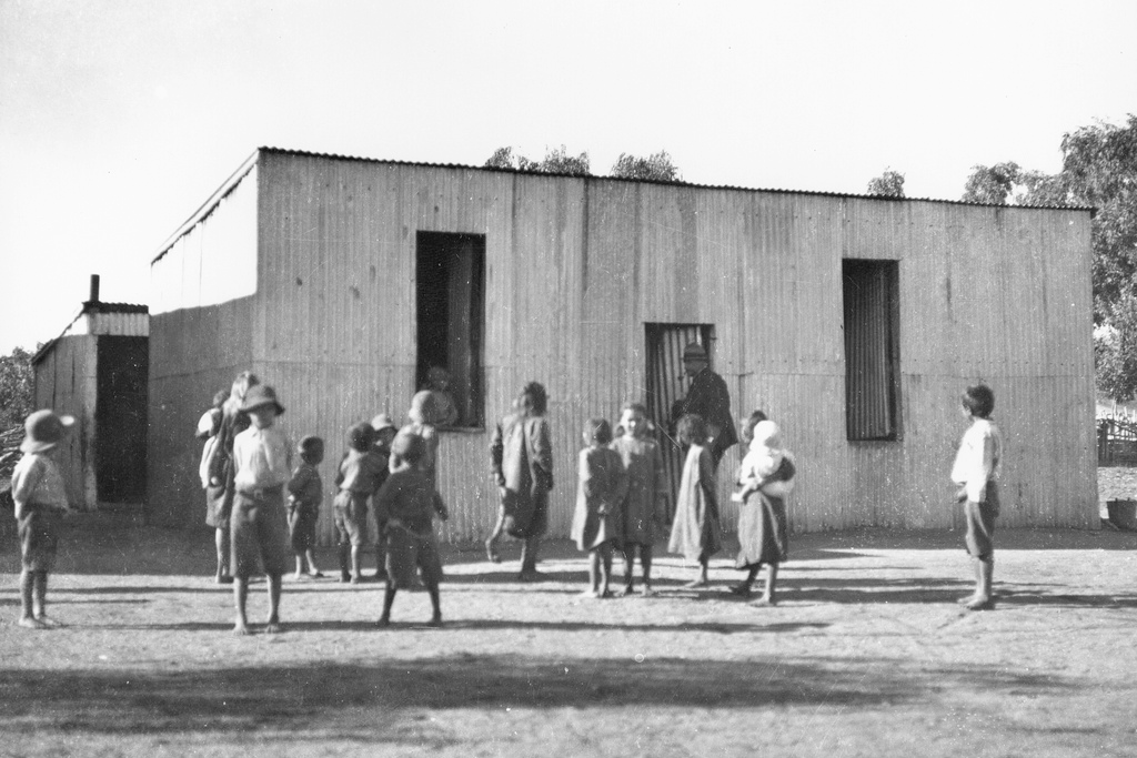 Protectionist legislation (beginning with the Northern Territory Aboriginals Act 1910 and South Australia’s Aborigines Act 1911) imposed stronger forms of government regulation over Aboriginal people’s lives from the early twentieth century. Local police officers often performed double duty as Protectors of Aborigines, and at Alice Springs, the local policeman Protector was Sergeant Robert Stott. In 1914, Ida Standley arrived in Alice Springs to teach the community’s children, and Sergeant Stott provided the Aboriginal rations storeroom as a temporary schoolroom. Initially 25 of Alice Springs’ children, both European and of mixed descent (referred to in the racist language of the time as ‘half-caste’), attended the school, with Mrs Standley assisted by Arabana woman Mrs Topsy Smith. Two of Topsy Smith’s daughters were among the school’s first students.