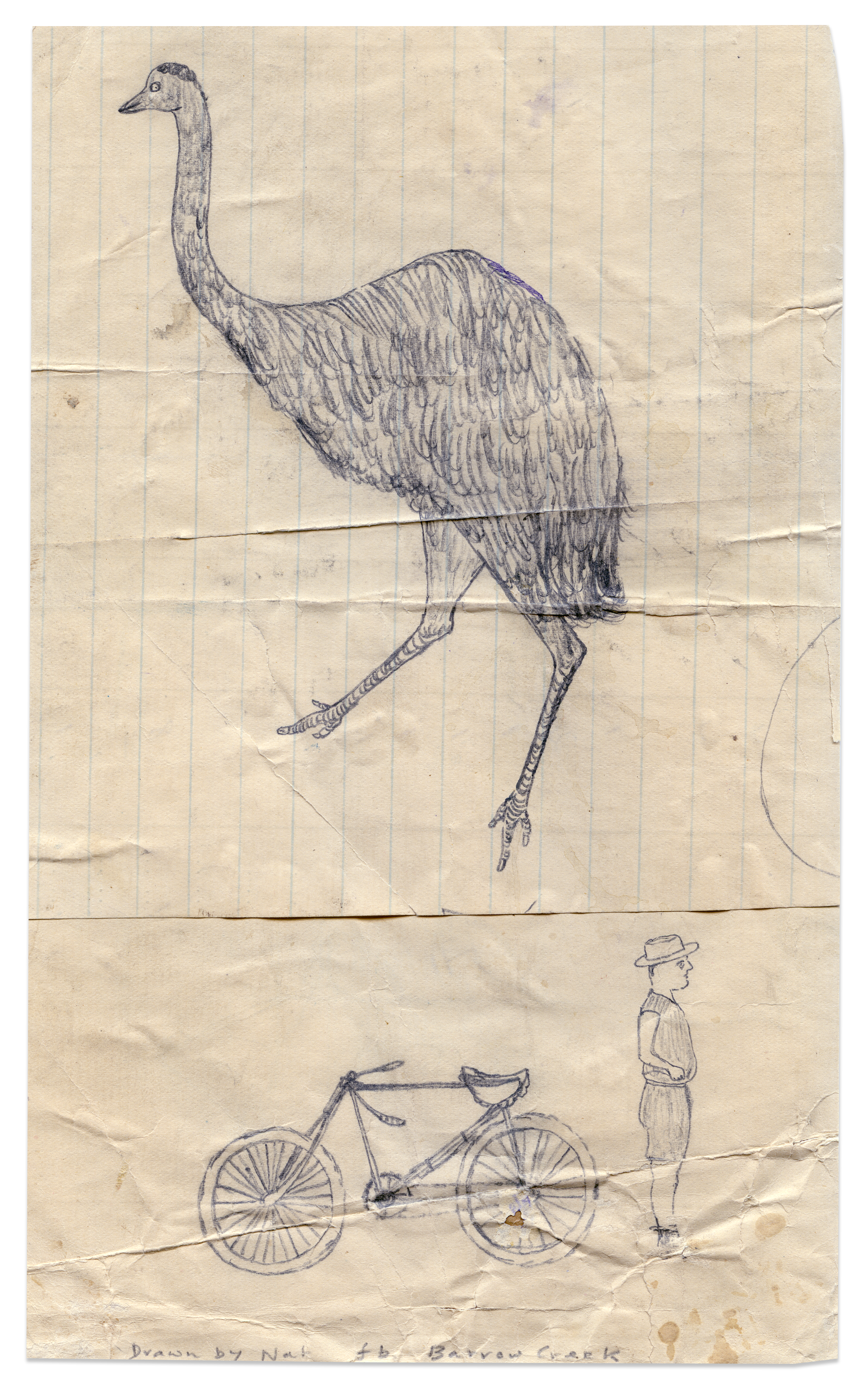 Examples of pencil sketches made by Nat Warano Williams at Barrow Creek during the 1920s. It seems that he was employed at the telegraph station, giving him access to paper and pencils. Here he has portrayed an emu, a bicycle and a boy. [SAM AA184-1-4001]