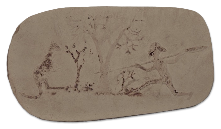 Gypsum plaque with etched design of hunter and kangaroo by Jim Kite Erliakilyika, ca.1910. [SAM A35739]