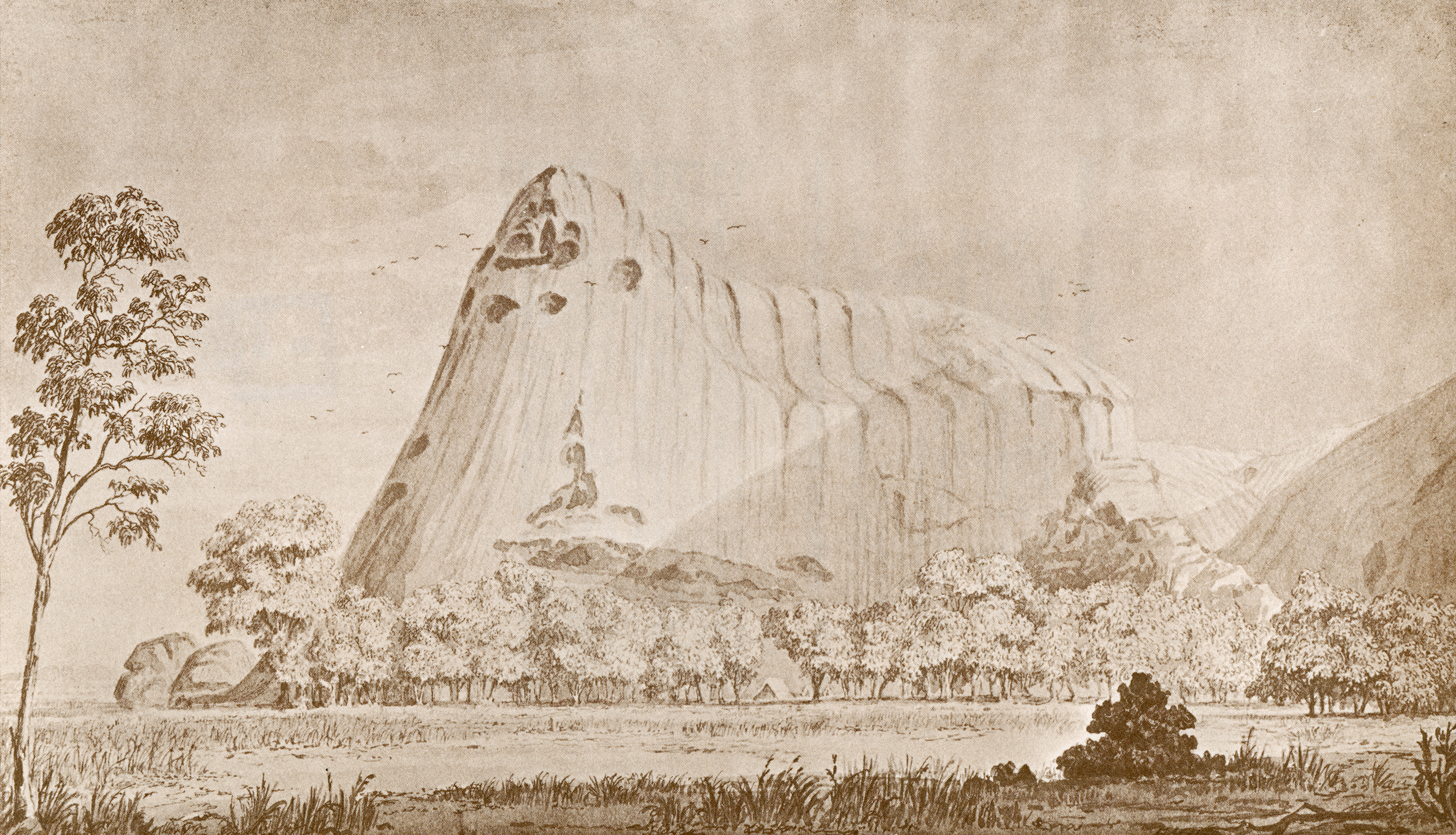 Other explorers relied on the Overland Telegraph Line as well as upon Aboriginal trackers and their bush-craft. William Gosse departed from Alice Springs in April 1873, in direct competition with Warburton’s expedition, but aside from being the first European to see Uluru (naming it Ayers Rock, after the South Australian premier), he was soon forced to retreat to the safety of the Telegraph Line. Gosse drew this sketch of Uluru, reached on 19 July 1873. He wrote in his journal: ‘in its side are large caves, which when viewed from a short distance cause it to present a most remarkable appearance’. (Gosse 1874) It would take another six or seven decades before anthropologists working with Anangu people began to understand the sacred significance of these features, and of the paintings contained in the caves and overhangs of the Rock.