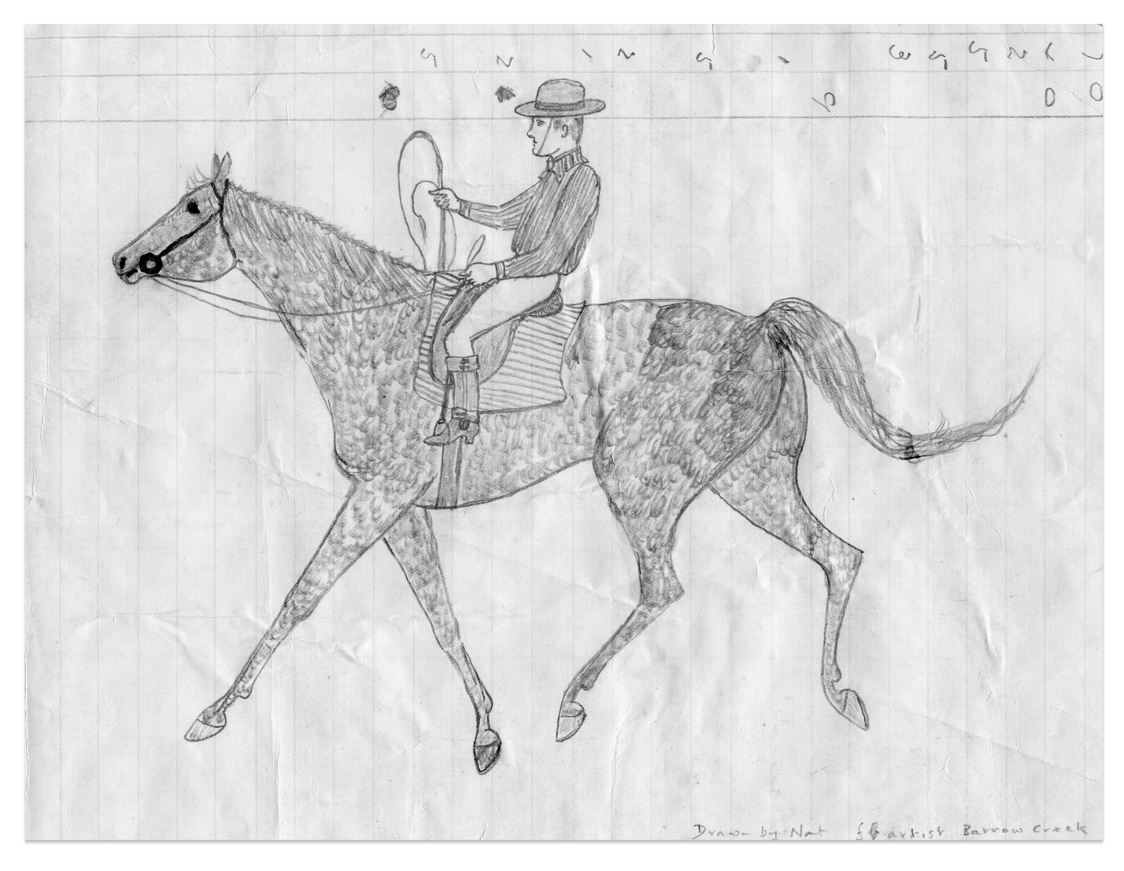 Examples of pencil sketches made by Nat Warano Williams at Barrow Creek during the 1920s. It seems that he was employed at the telegraph station, giving him access to paper and pencils. Here he has portrayed a white stockman. [SAM AA184-1-7003]
