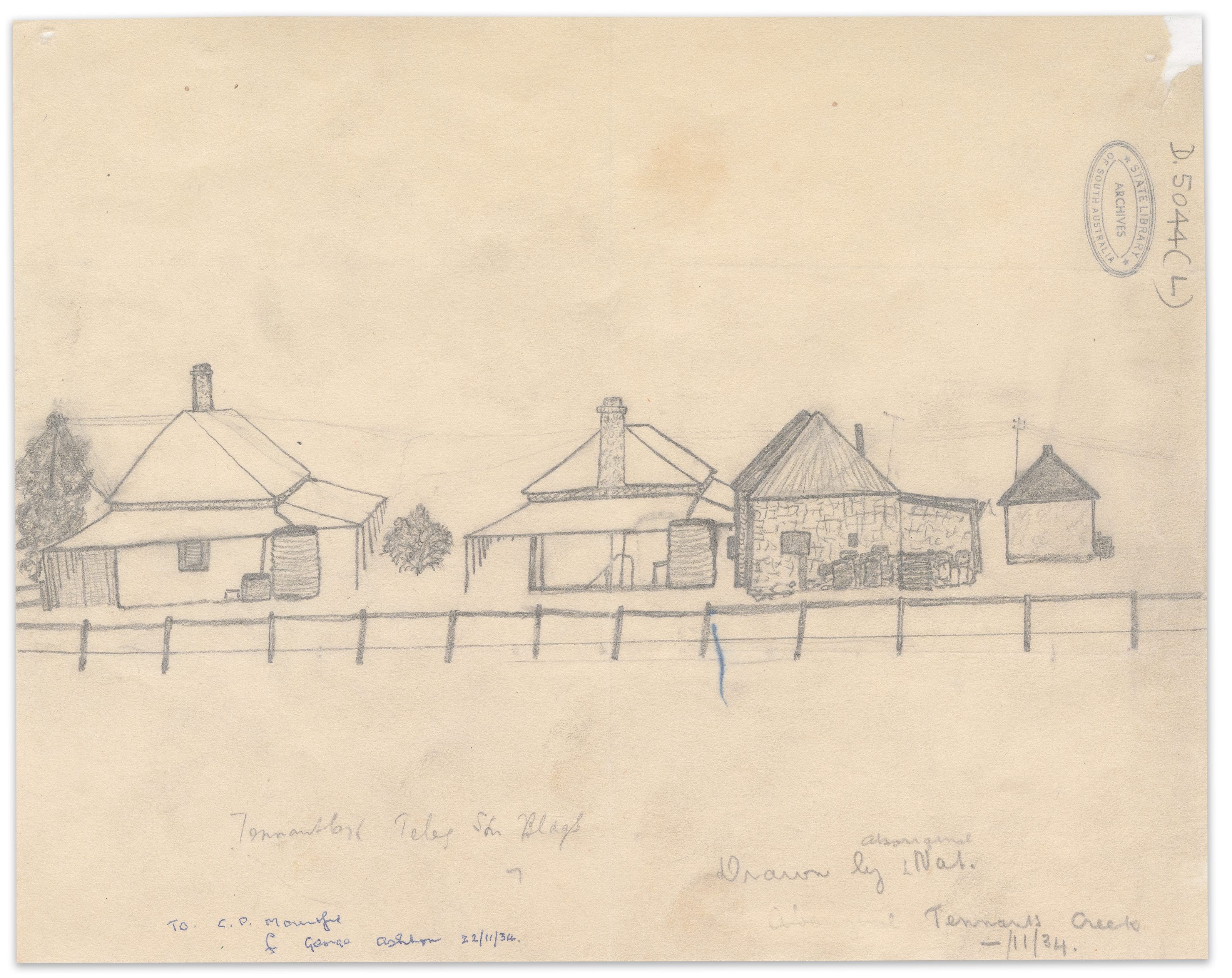 In 1934, the postmaster at Tennant Creek, George Ashton, wrote to the anthropologist Charles Mountford describing the population growth at Tennant Creek, now a budding gold town. He was responding to Mountford’s request to send Aboriginal drawings of ethnographic interest. Ashton didn't have access to any traditional Aboriginal art, but sent a sketch of the telegraph station by Warumungu senior man Nat Warano Williams. In his history of Tennant Creek, Dean Ashenden writes that Williams worked in the cattle industry and later with the army during the second world war. A nephew of Dick Cubadgee (Japaljarri), he was well known for his skills as a tracker and artist. His works included artefacts he painted for sale to tourists.