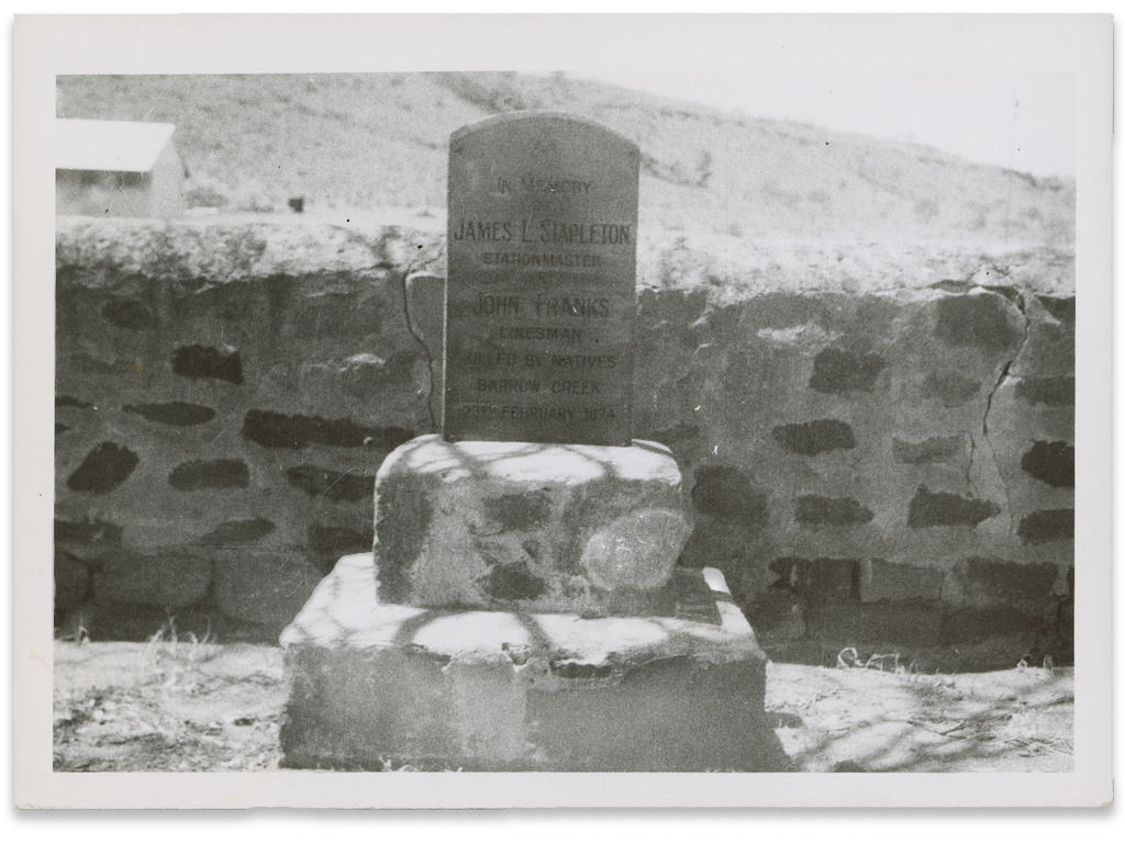Mounted Constable Samuel Gason led four punitive policing expeditions against the Kaytetye after the Barrow Creek Telegraph Station attack. His official report documented the deaths of 11 Aboriginal people, though other reports suggest that many dozens of people were killed. In Kaytetye oral history recorded by Grace Koch, Gason is still remembered for the retaliatory killing of many people. A gravestone at Barrow Creek Telegraph Station remembers the stationmaster and linesman James Stapleton and John Franks, and another monument in their memory was erected in 1876 by ‘the officers and men on the Overland Telegraph Line’. Not memorialised are the telegraph station’s Aboriginal employee ‘Jemmy’, who was also killed that day, and the many Kaytetye people killed by police parties in retaliation.