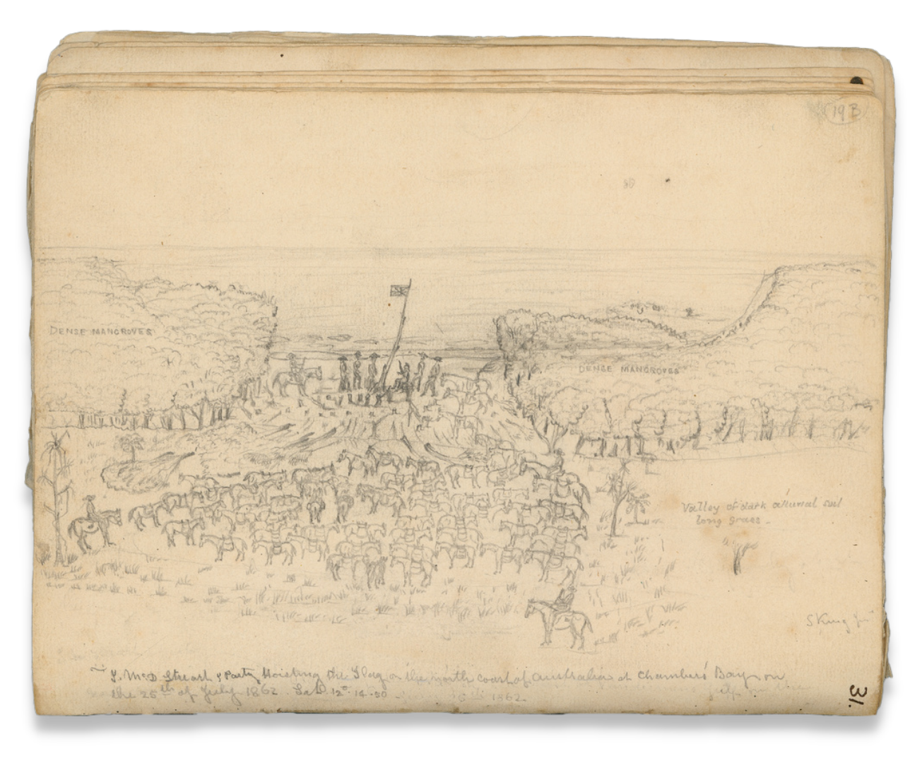 King sketch of Stuart's expedition hoisting flag at north coast [SLSA B 486/31]